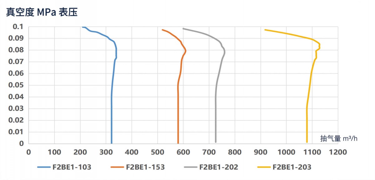 可滿足246~1380m³/h的中高抽氣量區間,其限度真空度也更高。采用彎曲葉輪設計,泵腔配備了一個單葉輪,上偏心設計,曲葉輪形成的液環流速穩定,湍流少,適用於大抽氣量、高真空度的工況。相比徑向葉輪,彎曲葉輪形成的液環,氣液摻混較小,整體壓差更小,可以更有效的實現氣體的吸入和壓縮,能量利用更有效。